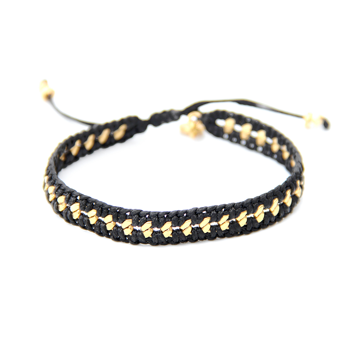 צמיד גורמט פליז בציפוי זהב 24K, סרוג עם חוט כותנה בסריגת קרושה עם סגירה מתכווננת.